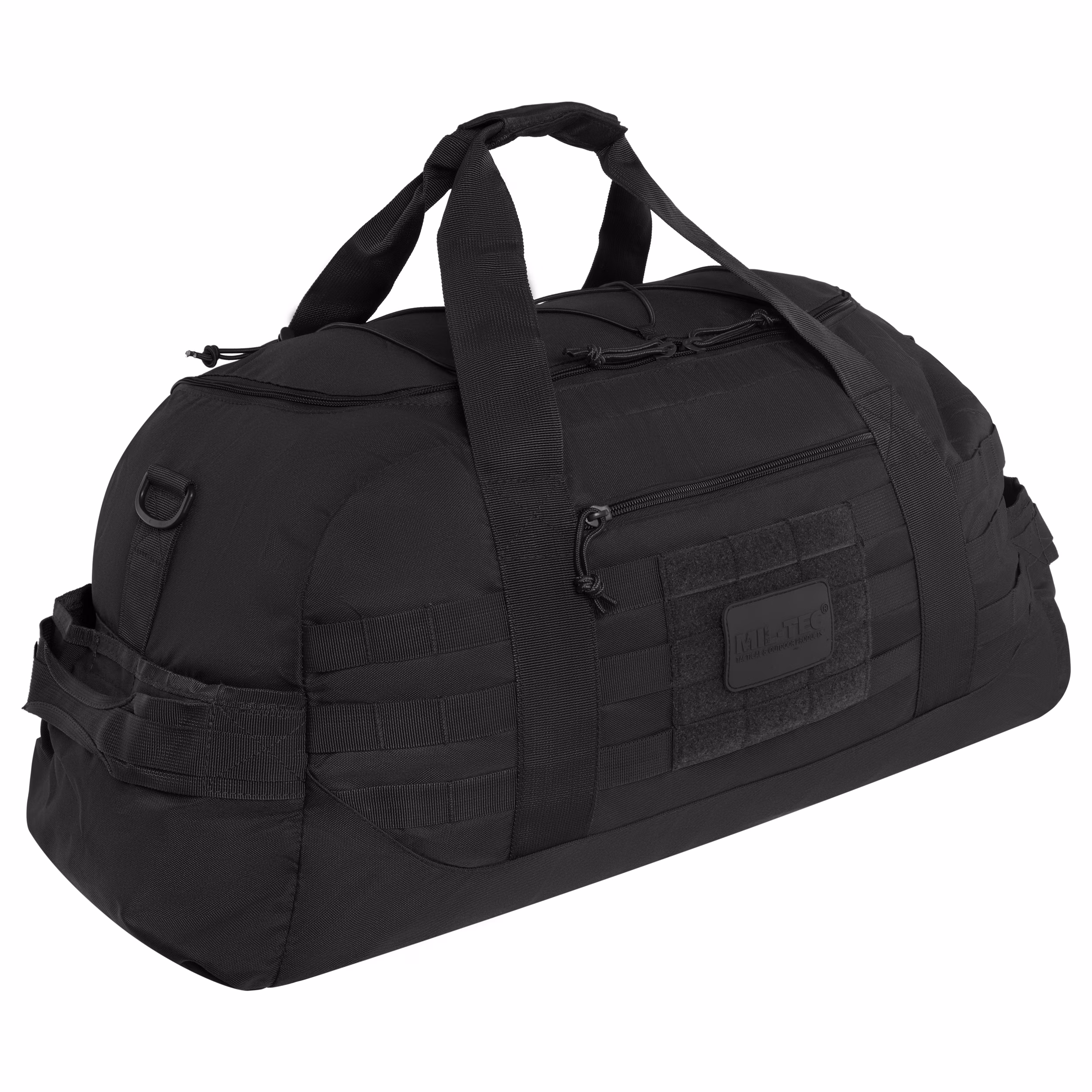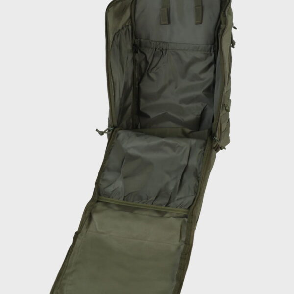 Kieszeń główna torby otwierana jest za pomocą zamka w kształcie litery U, co gwarantuje łatwy i szybki dostęp do ekwipunku. Po obu dłuższych bokach umiejscowiono dwie mniejsze kieszenie na zamek błyskawiczny. Na zewnętrznej powierzchni torby naniesiono system taśm kompatybilny z systemem MOLLE/PALS, umożliwiając zwiększenie pojemności o raz indywidualną konfigurację. Panel Velco ułatwia personalizację. Gumowa linka na górze torby pozwoli na przymocowanie np. kurtki. Wygodną obsługę zapewniają regulowany pas na ramię oraz wyściełany uchwyt.